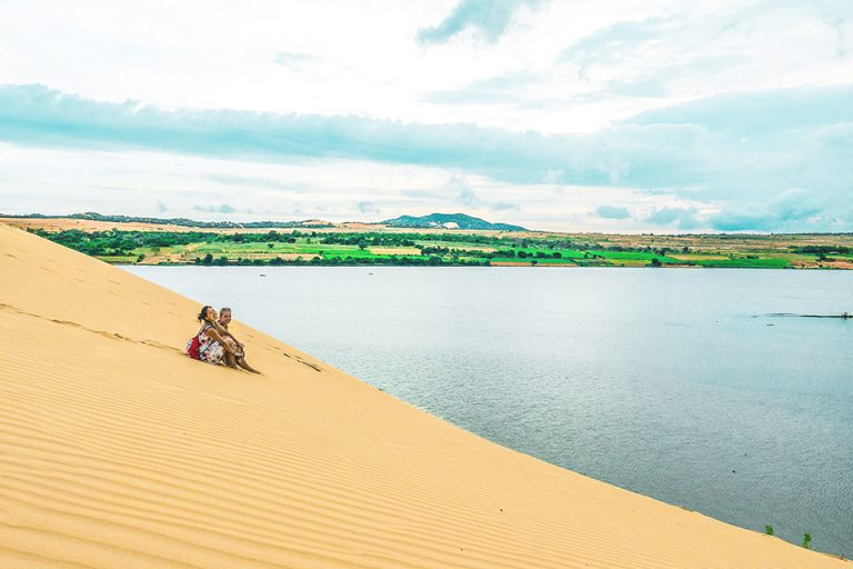 Dali jsme si oběd a zase jsme si pronajali skútry. Tentokrát jsme jeli k písečným dunám. V Mũi Né jsou 2 druhy písečných dun – červené a bílé. My jsme se rozhodli pro bílé, protože jsme chtěli jet na čtyřkolkách. Musím říct, že to byl pro mě nejlepší zážitek celého výletu! Takový adrenalin jsem už dlouho nezažila! Zezačátku jsme nechali Dana a Longa, aby si to zkusili. Já se Šárkou jsme raději jen seděly za nimi. Nebojte se, hlídali nás mladí zkušení borci. Ti nám pak nabídli, abychom si jen sedli za ně, že to tam celé projedou. Lidi, jestli nemáte odvahu, tak to nedělejte :-D. Oni jezdí po písečných dunách jako blázni :-D! Po jízdě na čtyřkolkách jsme už jen blbli.