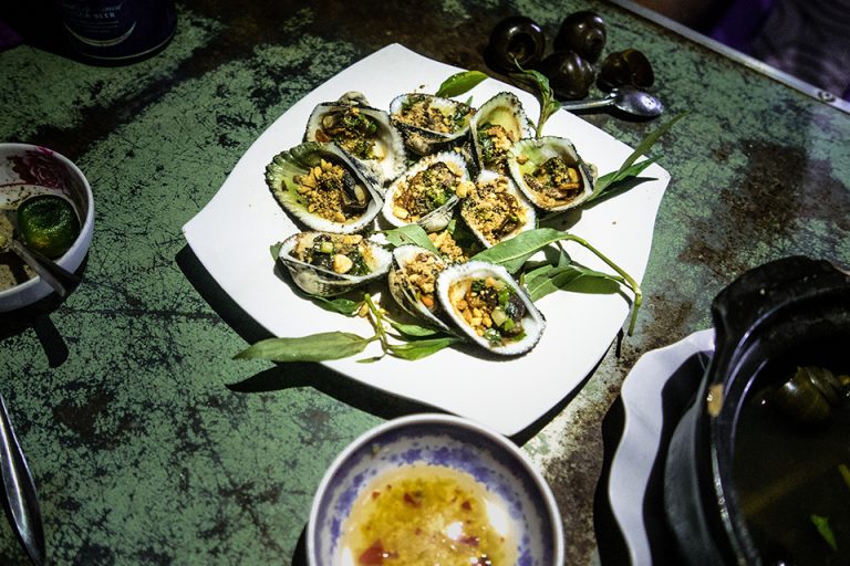 Ještě před stmíváním jsme se vraceli do hotelu a šli na večeři. Děcka poprvé ochutnali mušle, šneky v citrónové trávě a místní specialitu jménem vú nàng (v překladu ženská prsa). Je to jeden z druhů mušlí, který se tam prodává. Naši kamarádi poprvé viděli i vietnamské karaoke na ulici. Pánové tam zpívali opravdu dobře a pozvali i naše kamarády, aby se k nim přidali. Bohužel zde ve 22h už musí být klid, takže naše děcka neměly možnost zazpívat nic českého.