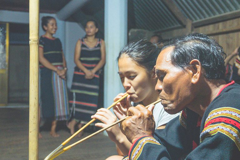 Večer jsme měli možnost připojit se ke skupině, kde místní hráli svůj folklor. Tancovali jsme spolu a pili jsme s nimi místní kořalku. Ve Vietnamu se tomu říká rượu cần, což je rýžové víno v baňce a pilo se z dlouhého brčka. Super zážitek.